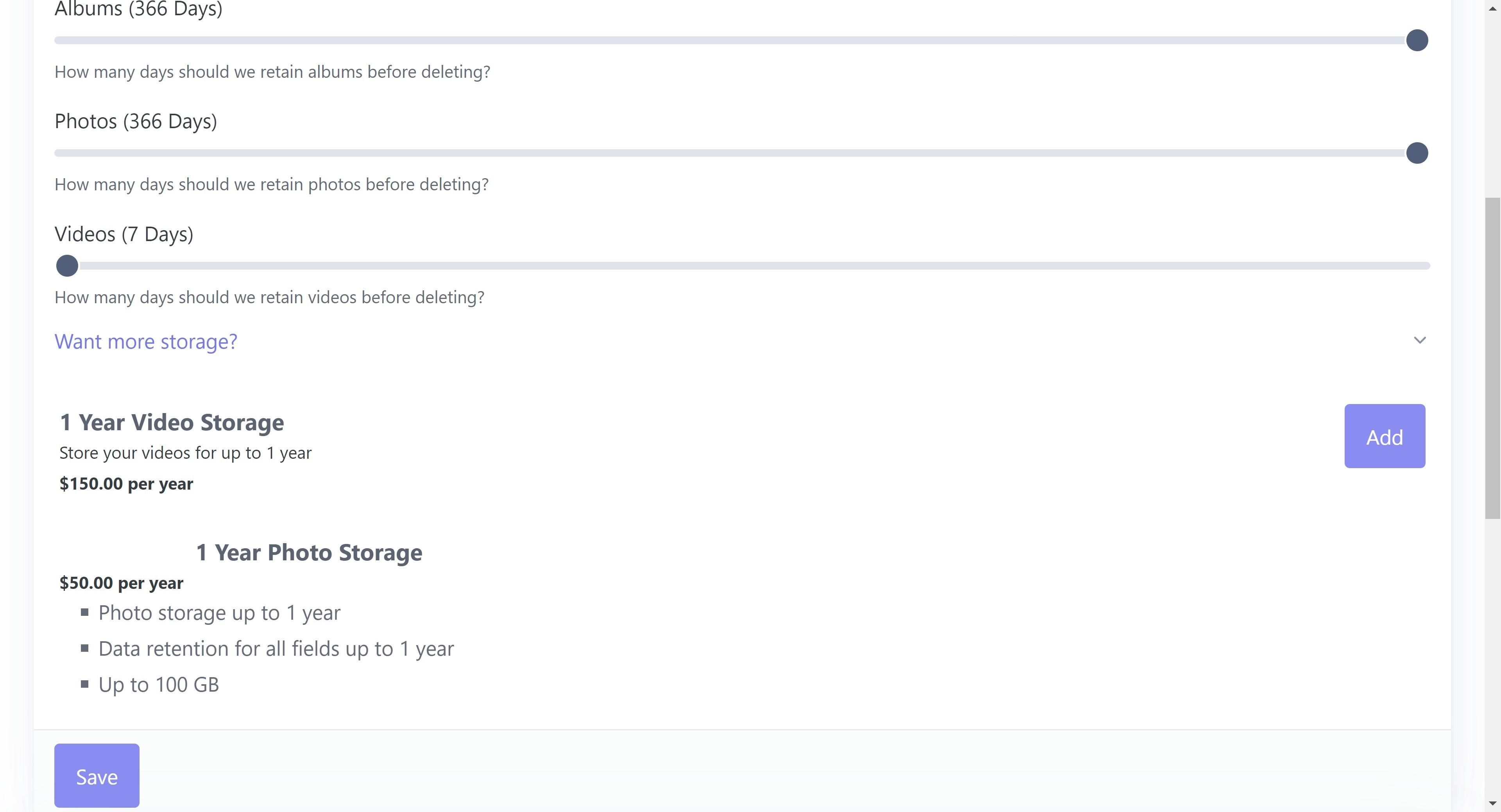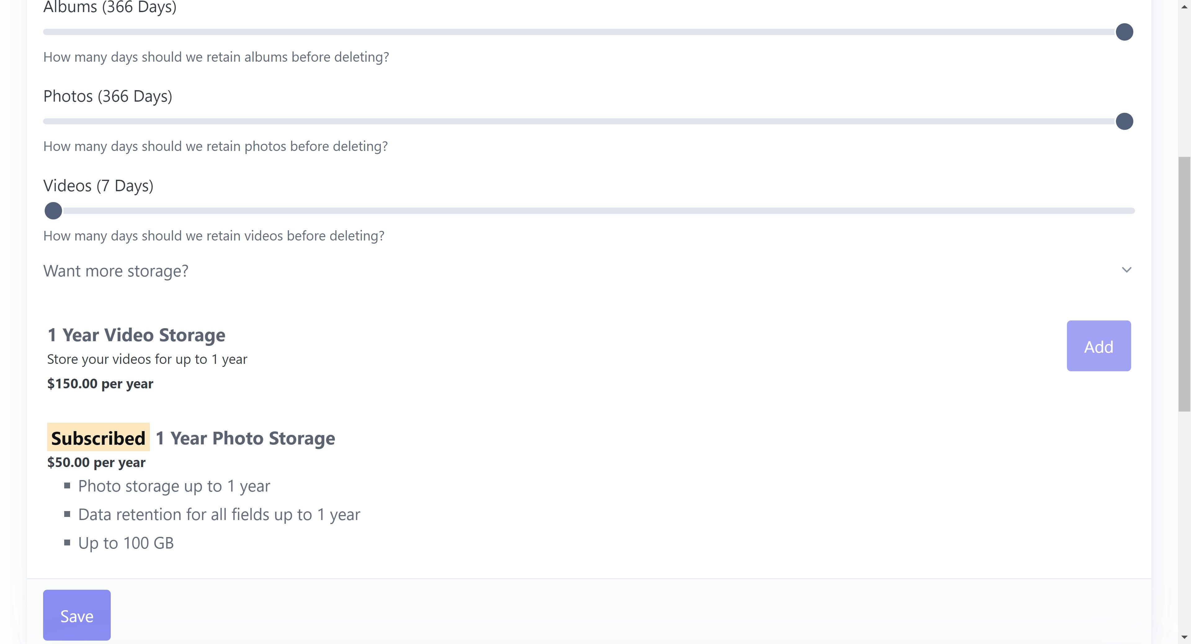 4. Select "1 Year Photo Storage"