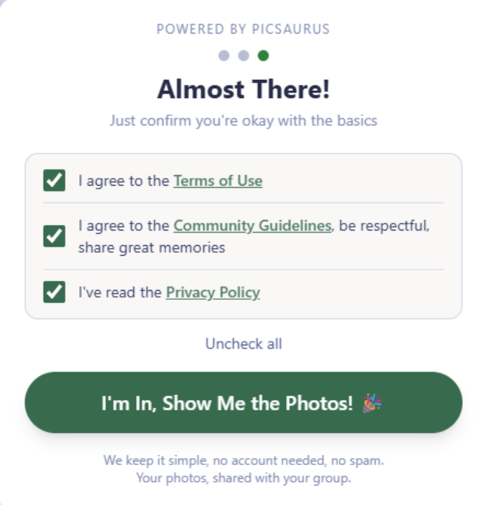 Around 30 minutes before the tour begins, all guests in an album will receive a pre-tour email, inviting them to access the gallery. Once they click the gallery link, they will be prompted to accept the terms of use, community guidelines, and privacy policy as shown below.