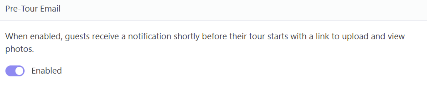 Admins can also view, download, and delete guest uploaded images via the Admin Workspace: https://roar.picsaurus.com/app/in/me/media. If you don't want to send guests pre-tour emails, you can disable them via the Admin Workspace: https://roar.picsaurus.com/app/in/me/misc (shown below) or in the Picsaurus app's account settings.